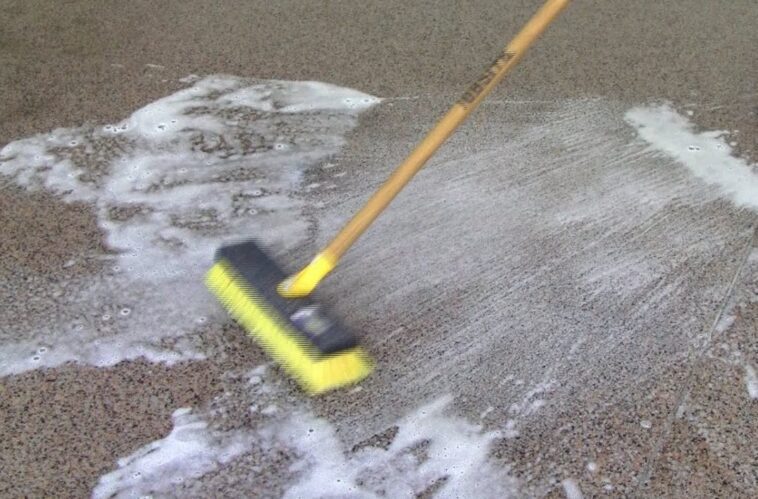 Scrub the floor: Using a stiff-bristled brush or a floor scrubber, work the cleaning solution into the garage floor. Pay extra attention to any areas with stains or heavy grease buildup.