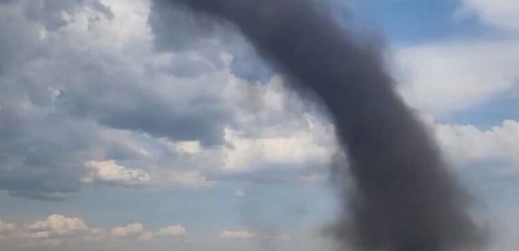 Report says the thunderstorm picked a lot of dirt from farmers’ fields and was visible from several kilometers away. The cloud was very dark in color and formed a long curve toward the ground.