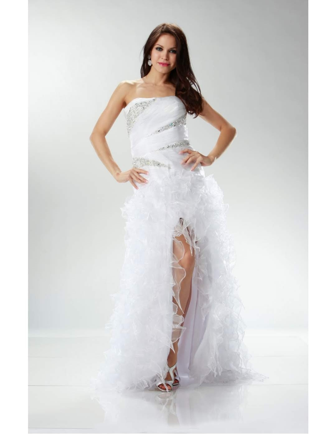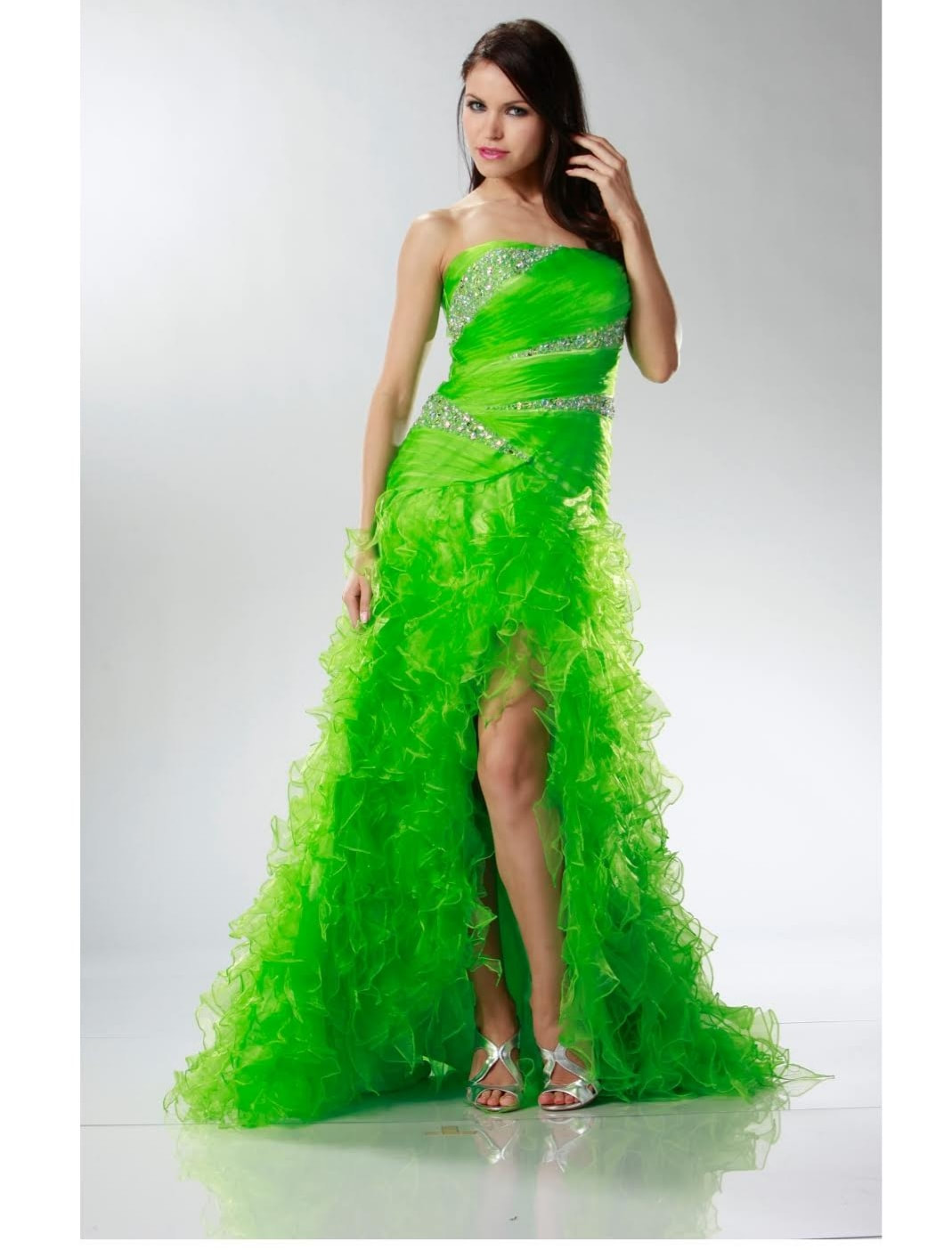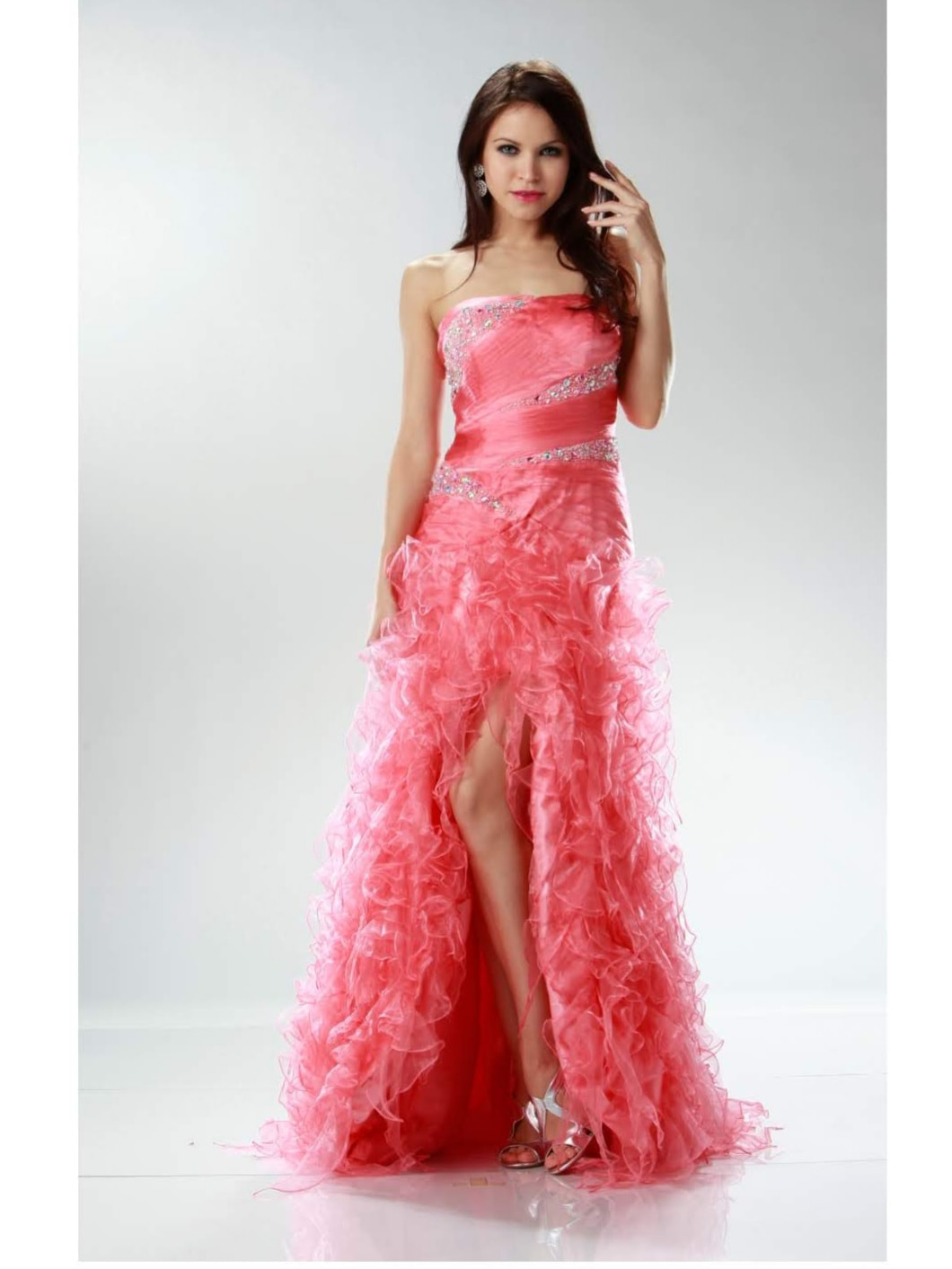 Shiny organza flirty ruffle bottom dress. Bodice is ruched pleated and laid with hand beaded rhinestones. Comes With detachable spaghetti straps.