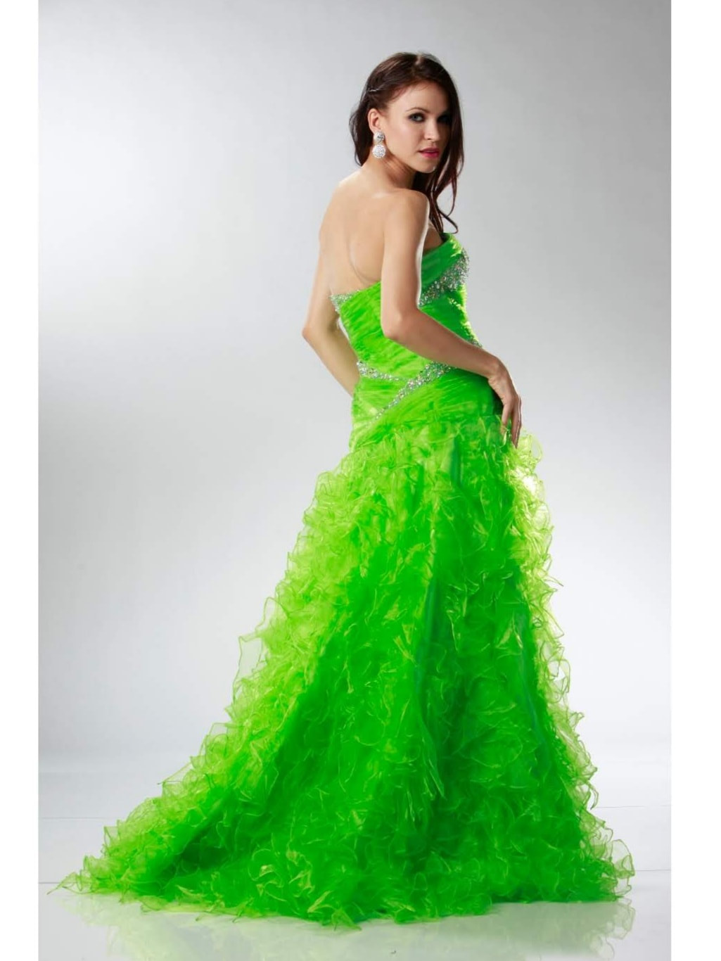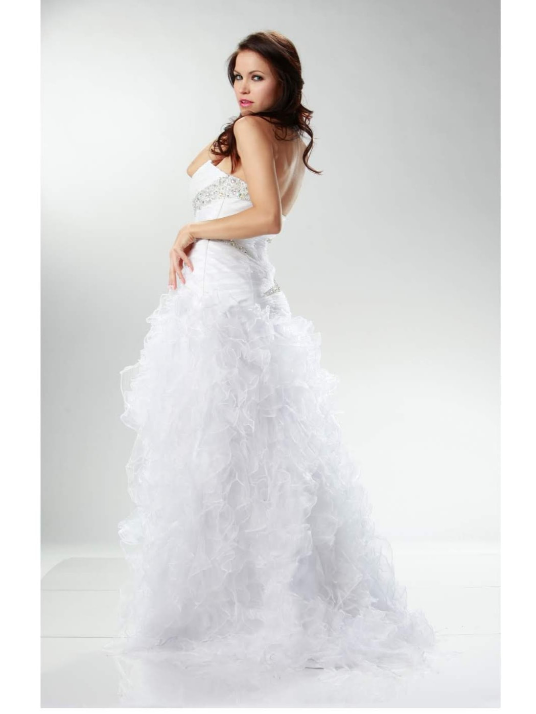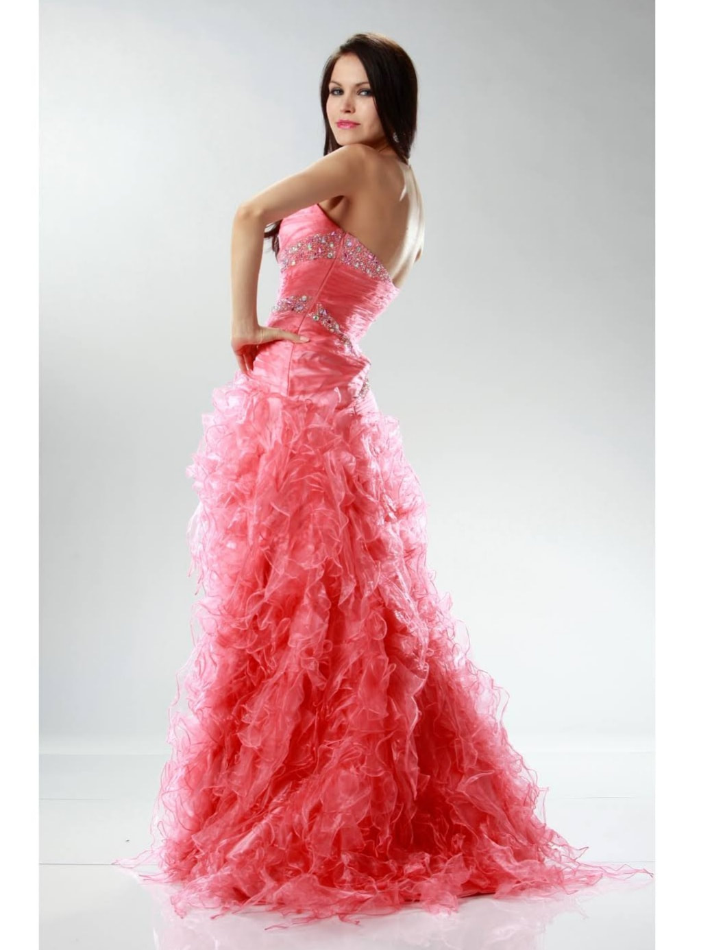 Shiny organza flirty ruffle bottom dress. Bodice is ruched pleated and laid with hand beaded rhinestones. Comes With detachable spaghetti straps.