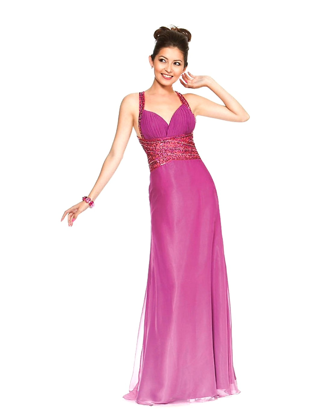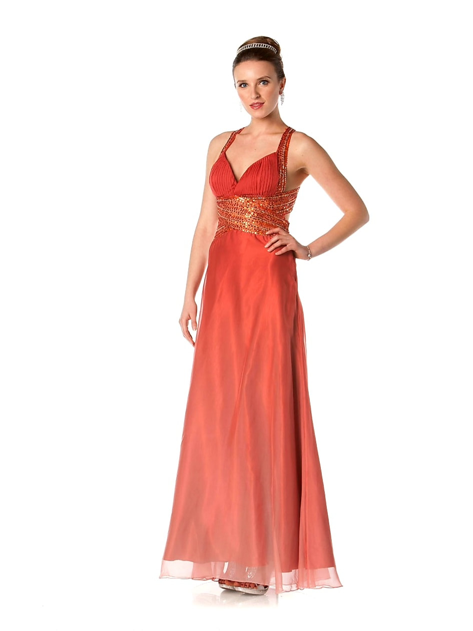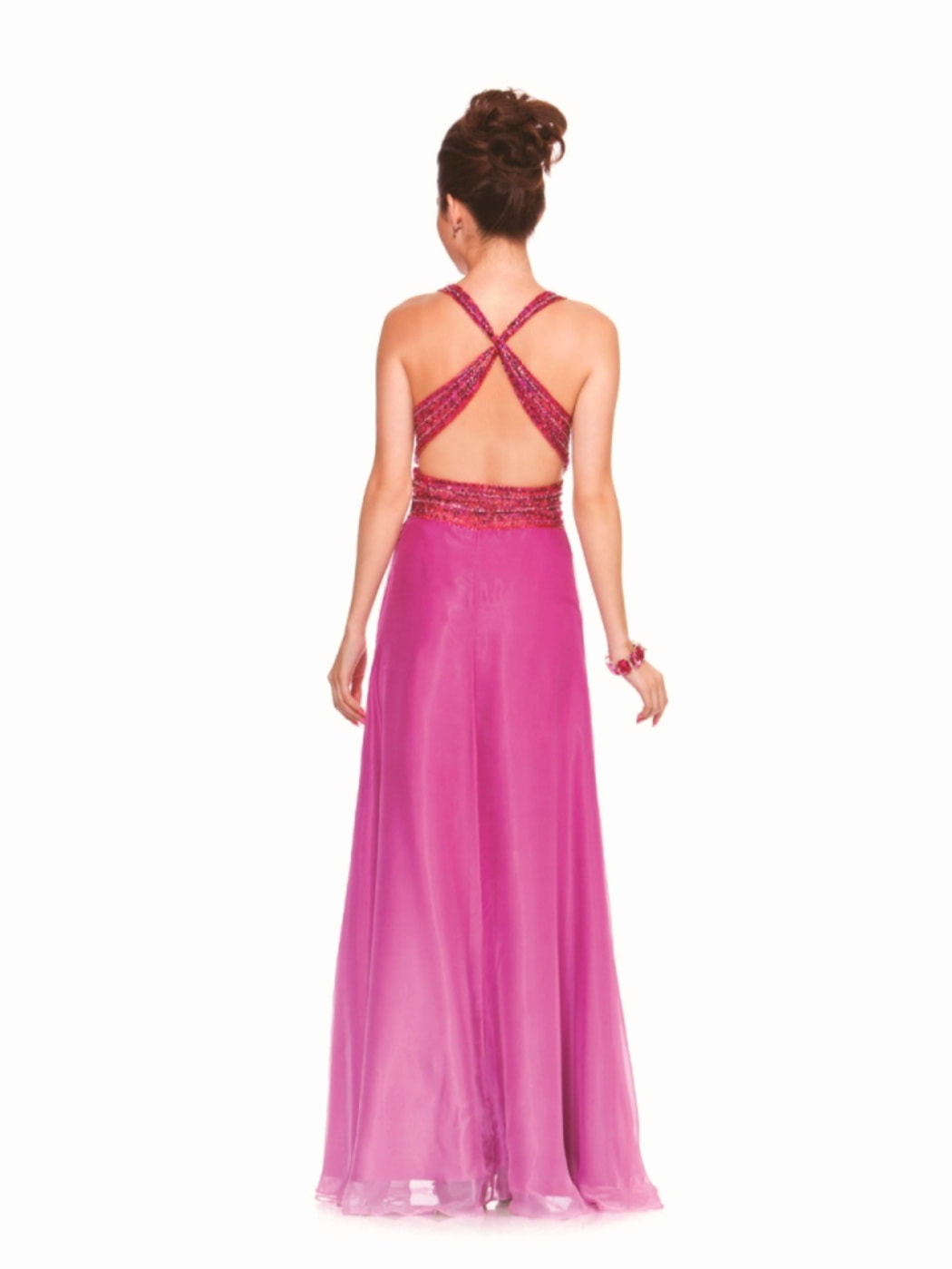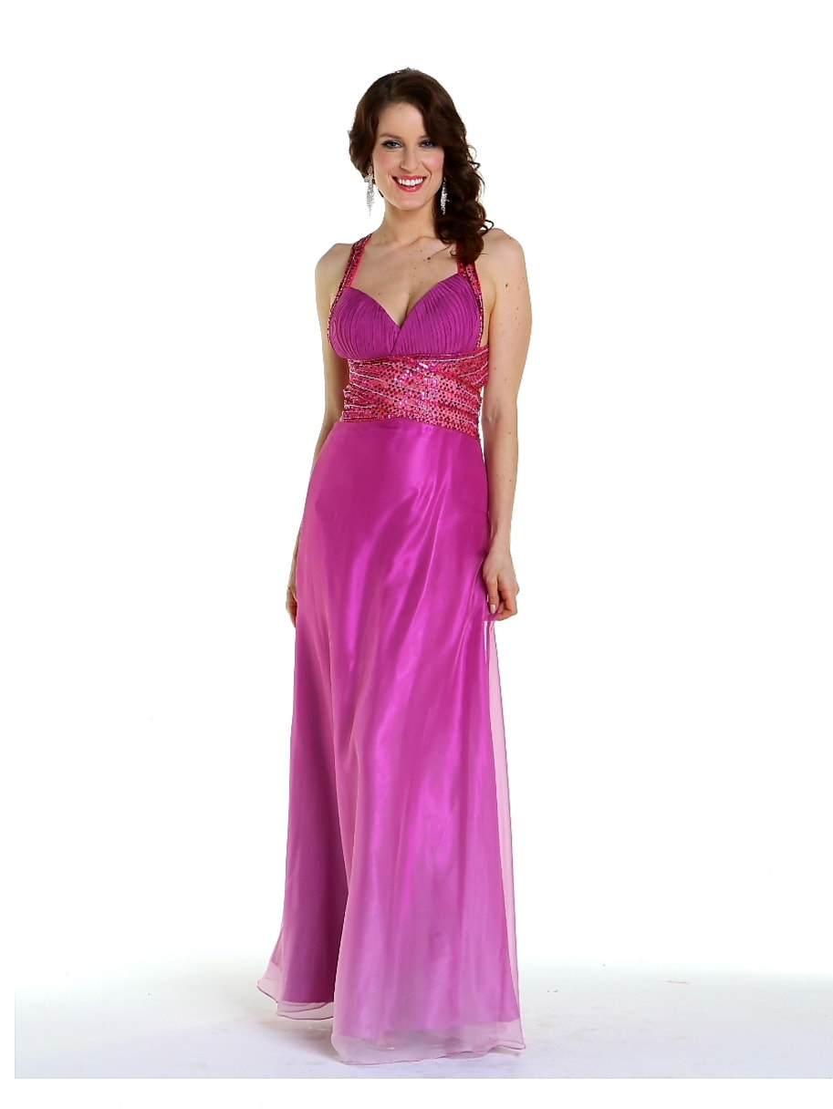 Tie dyed chiffon full length gown with sequin accents through the waist, back, and straps. There are folds along the bust and there is a sexy open back with crossing straps.