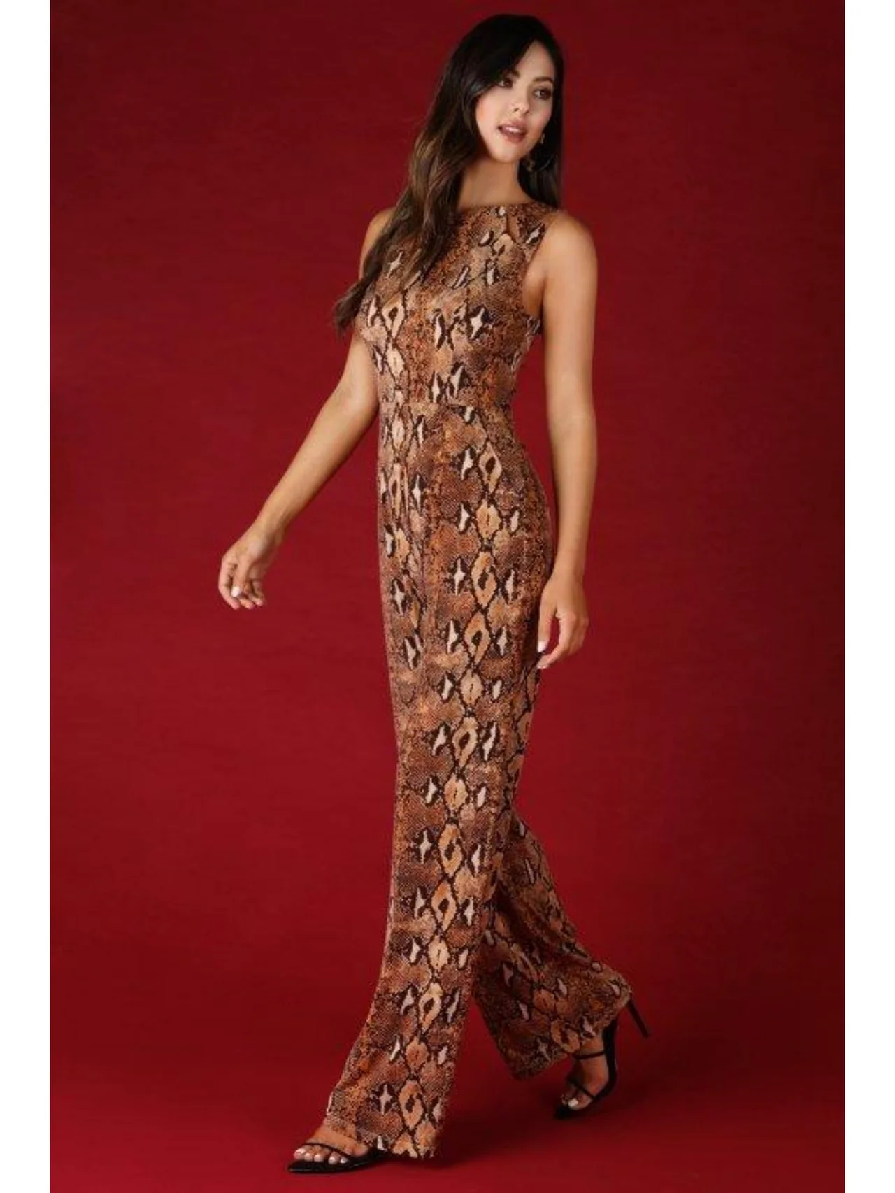 Anaconda high neck Jumpsuit Back Zipper with pockets 95% Polyester, 5% Spandex Hand Wash cold water Model is 5’9″ and wearing a small