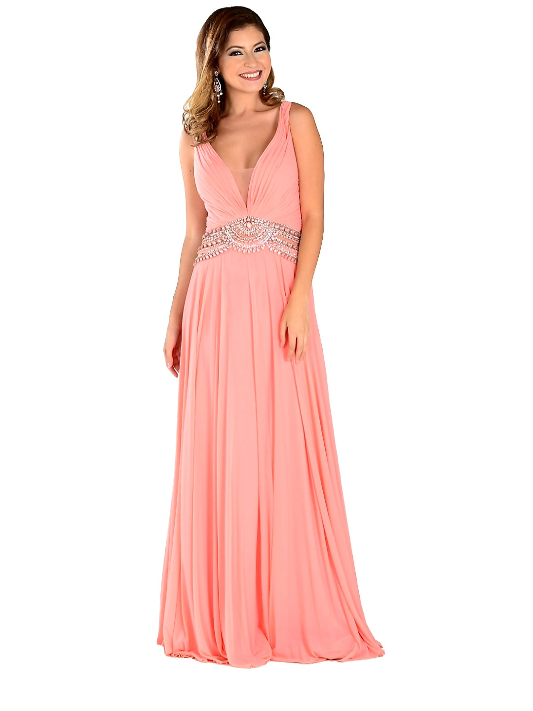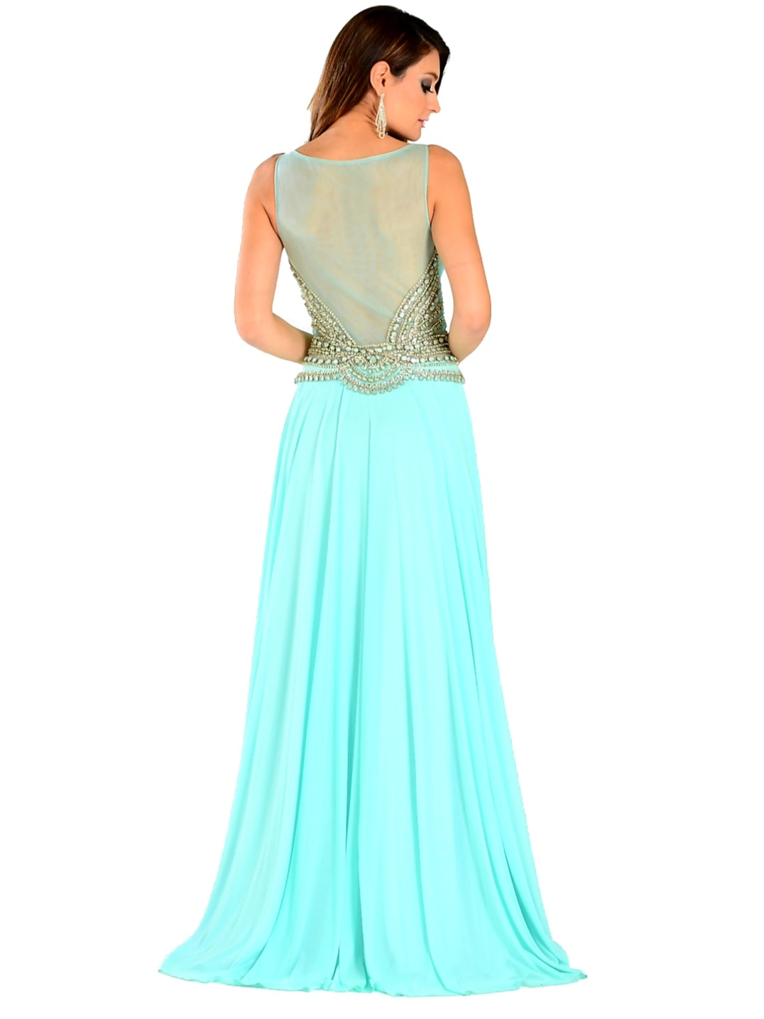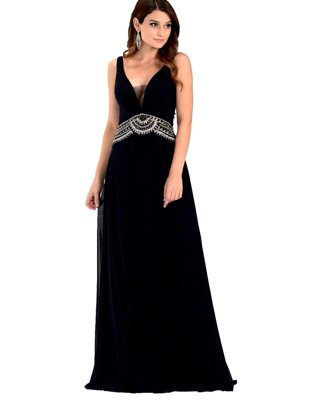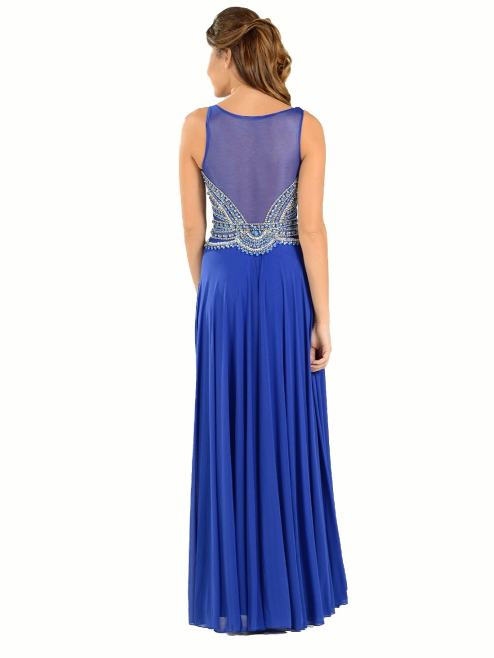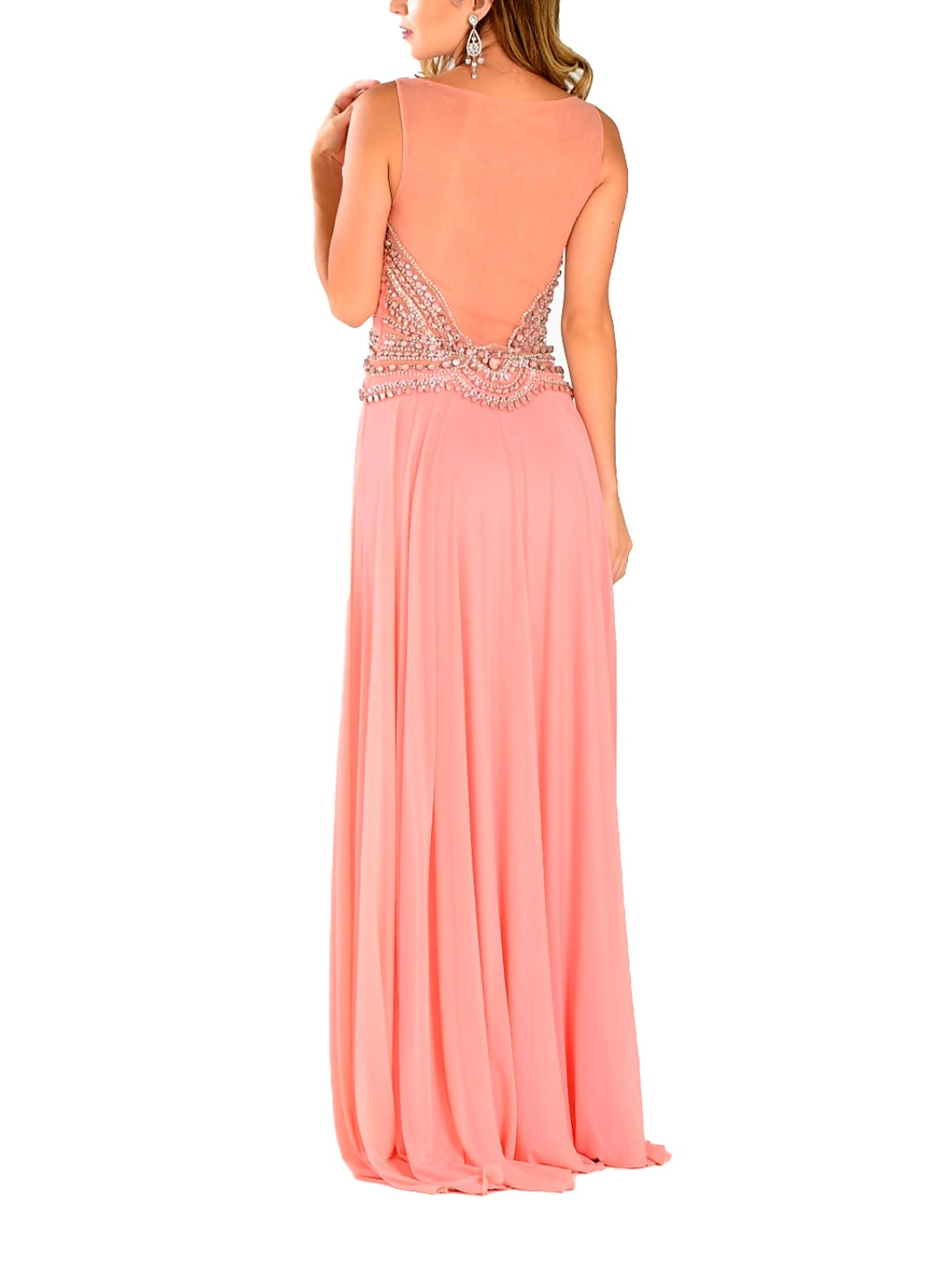 Span Mesh long dress with deep V-neckline. Sheer waist and back adorned with stunning rhinestones.