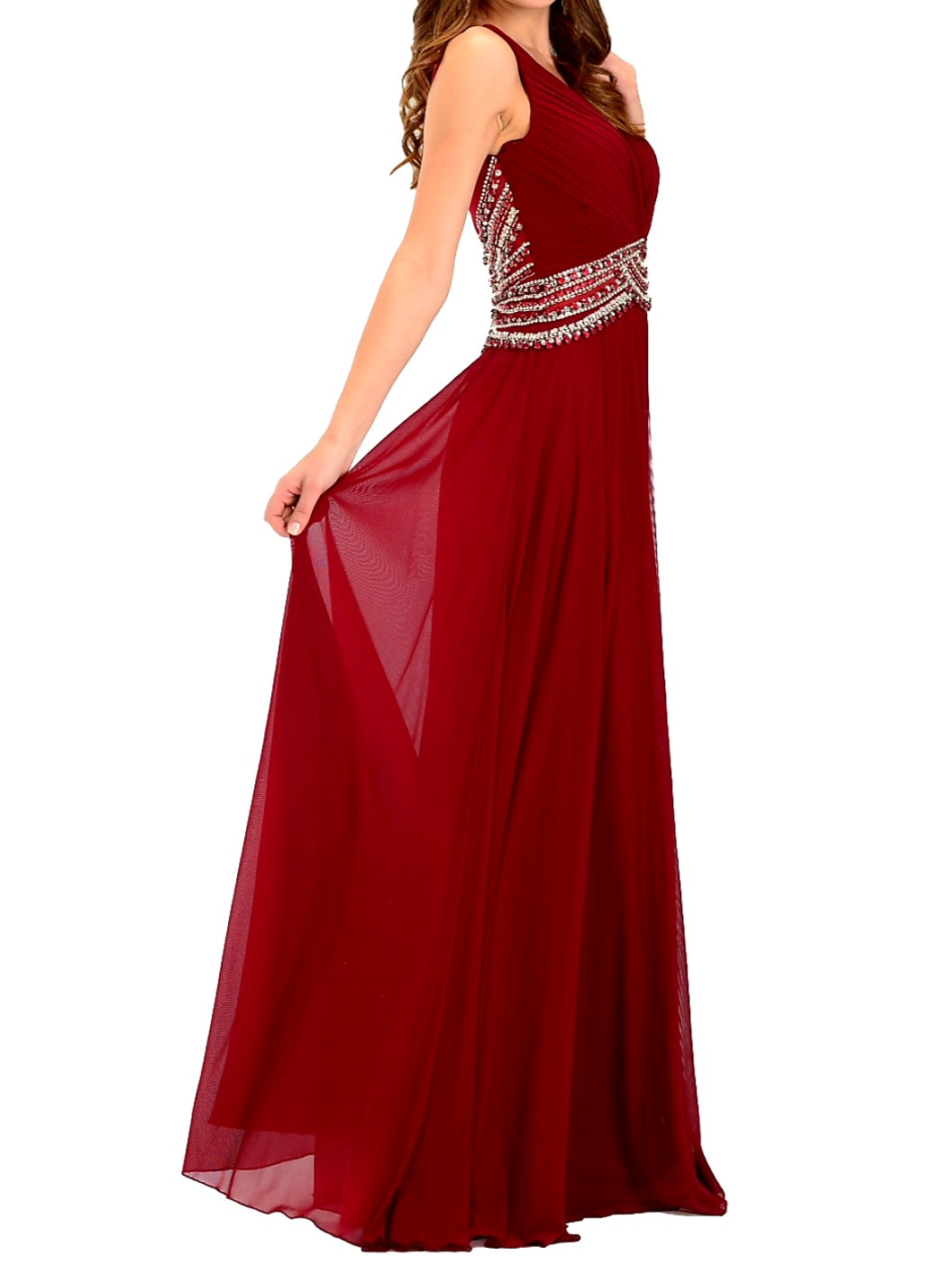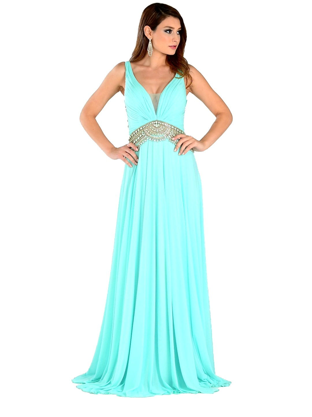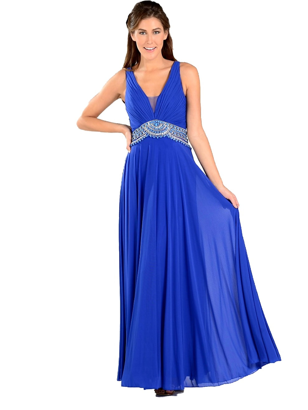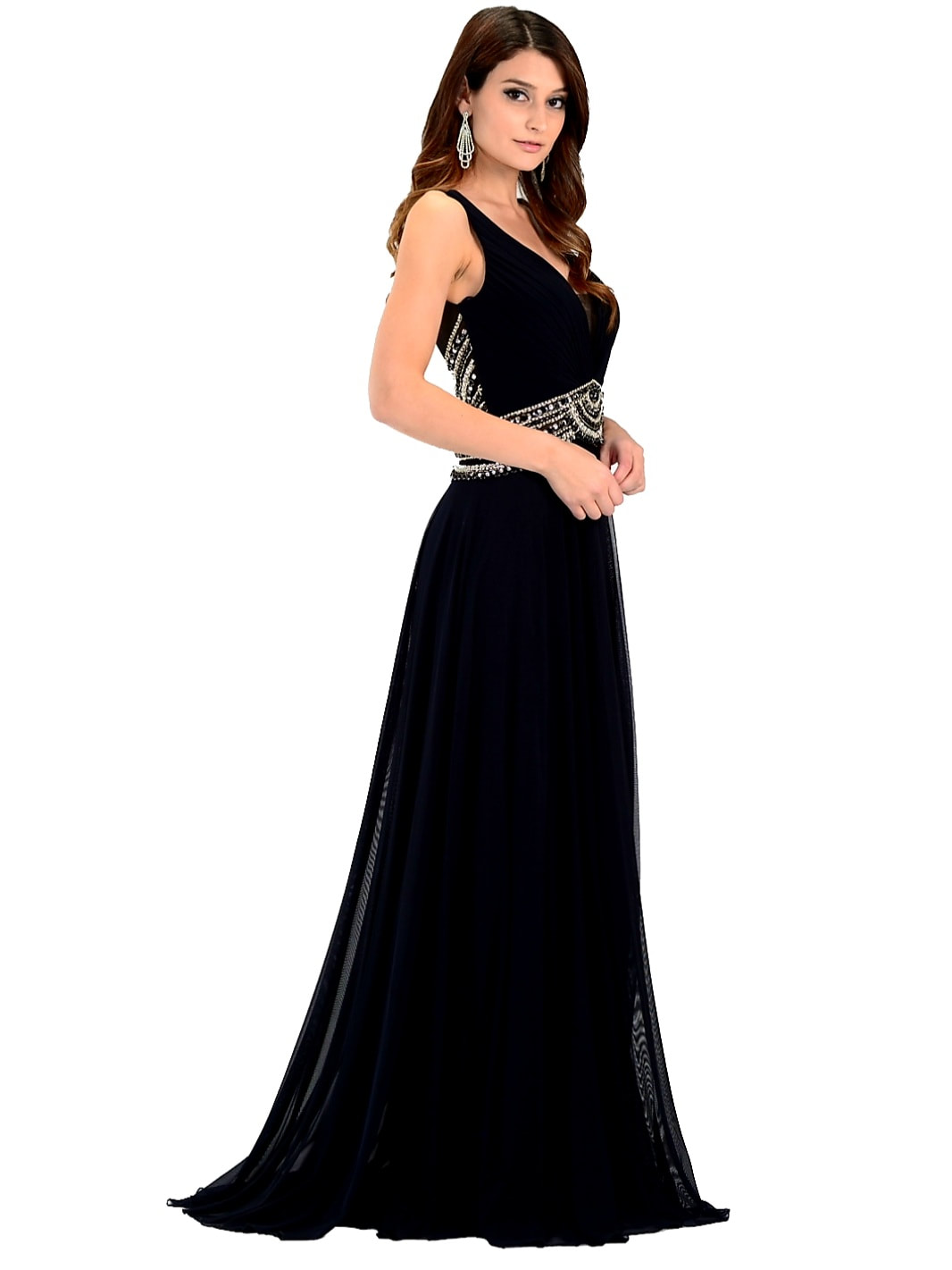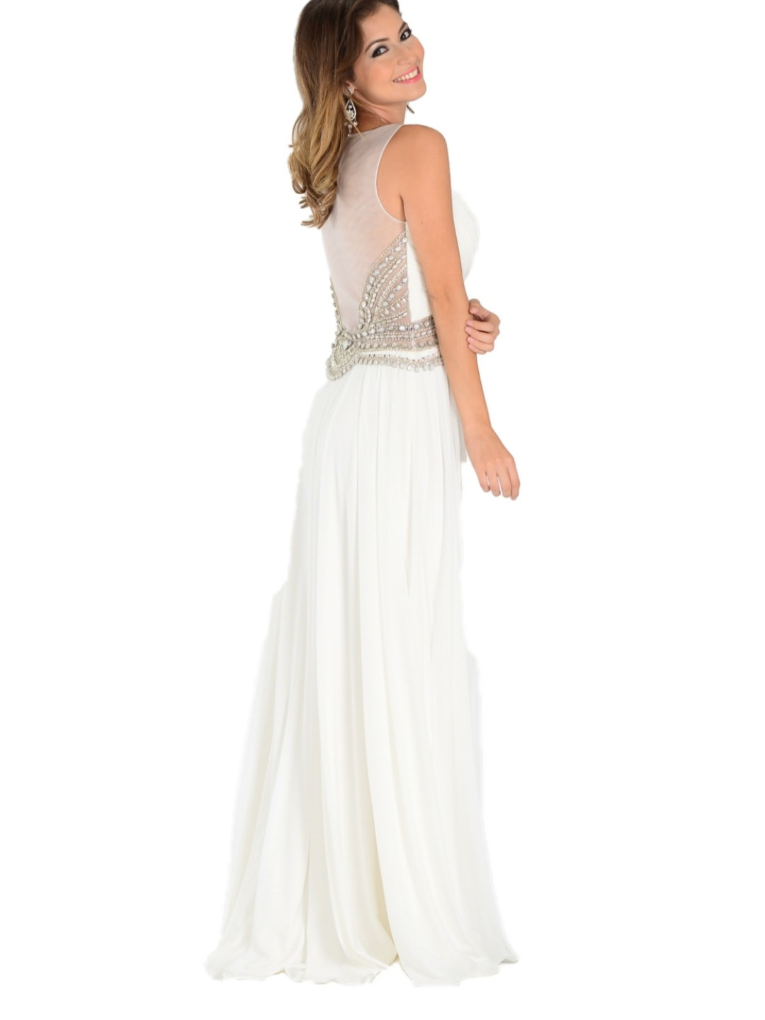 Span Mesh long dress with deep V-neckline. Sheer waist and back adorned with stunning rhinestones.