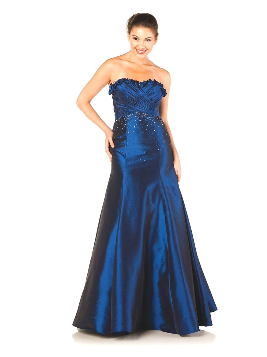 Full length gown with sweetheart bodice and ruffled bust line along with jewel beneath the empire waistline.