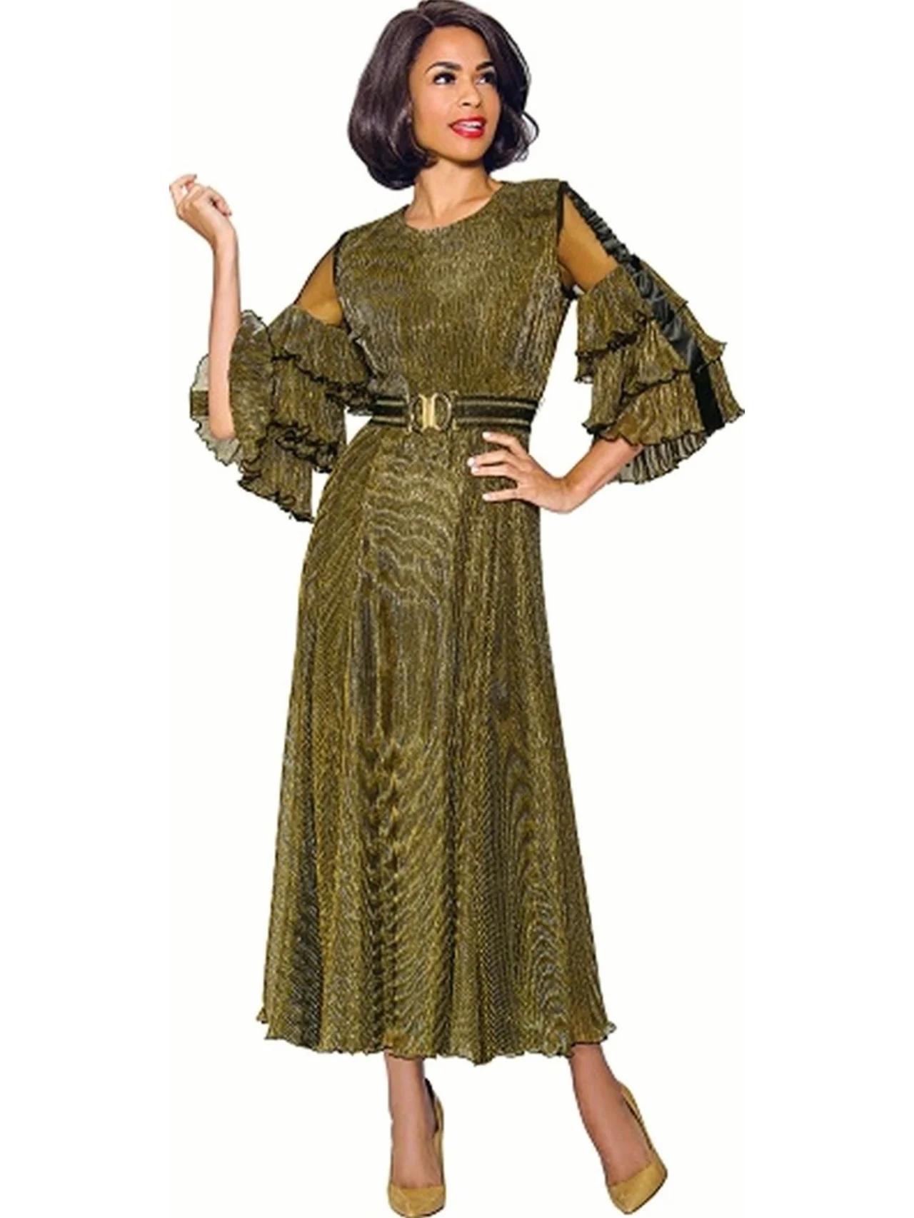 Maxi pleated dress with sheer layered ruffled bell sleeves and belt.