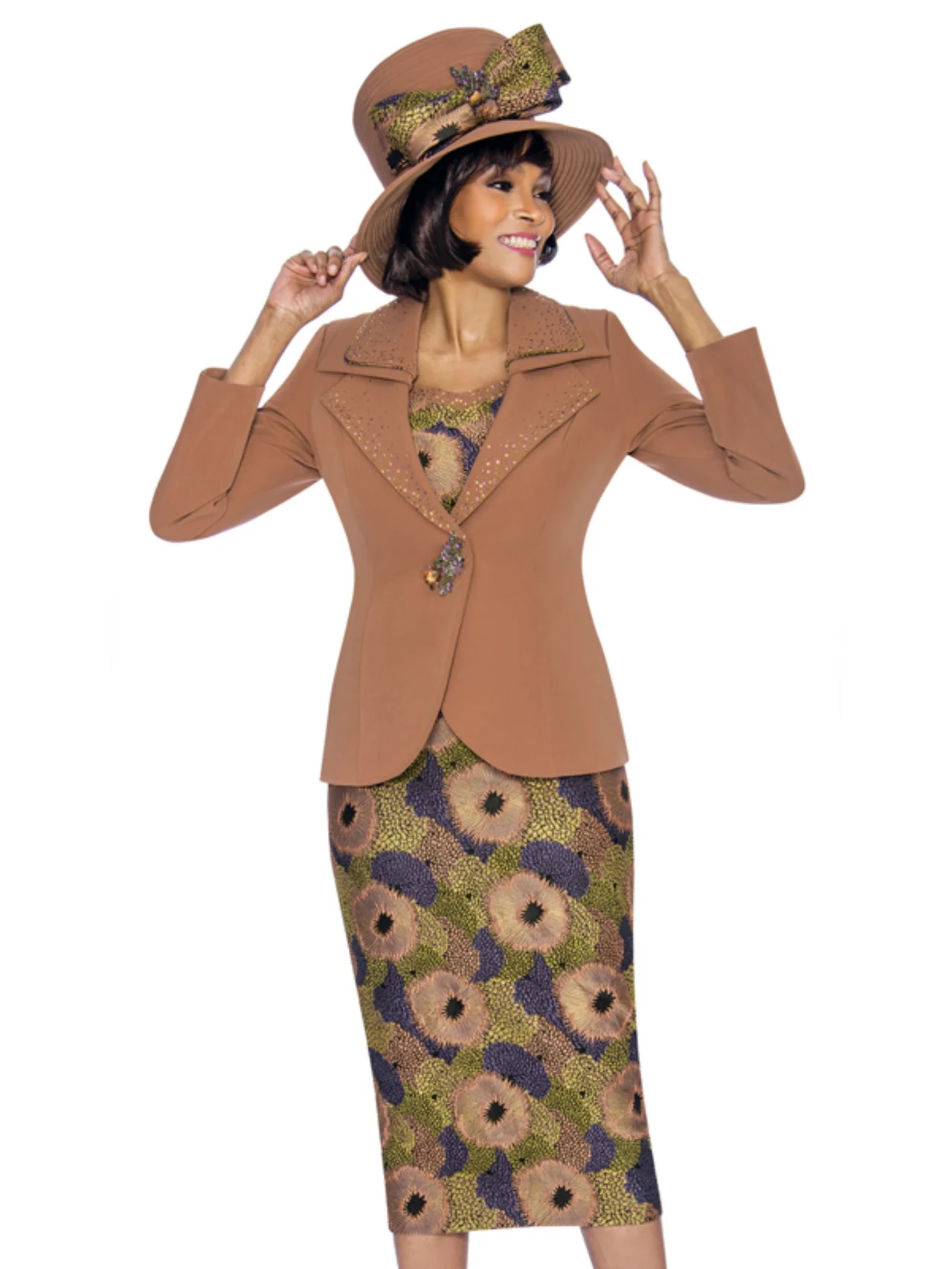 Three piece floral skirt suit – Beautiful floral pencil skirt and cami. Jacket has wide lapel collars detailed with embellishments. Jacket also has long sleeves with statement button. *Hat not included