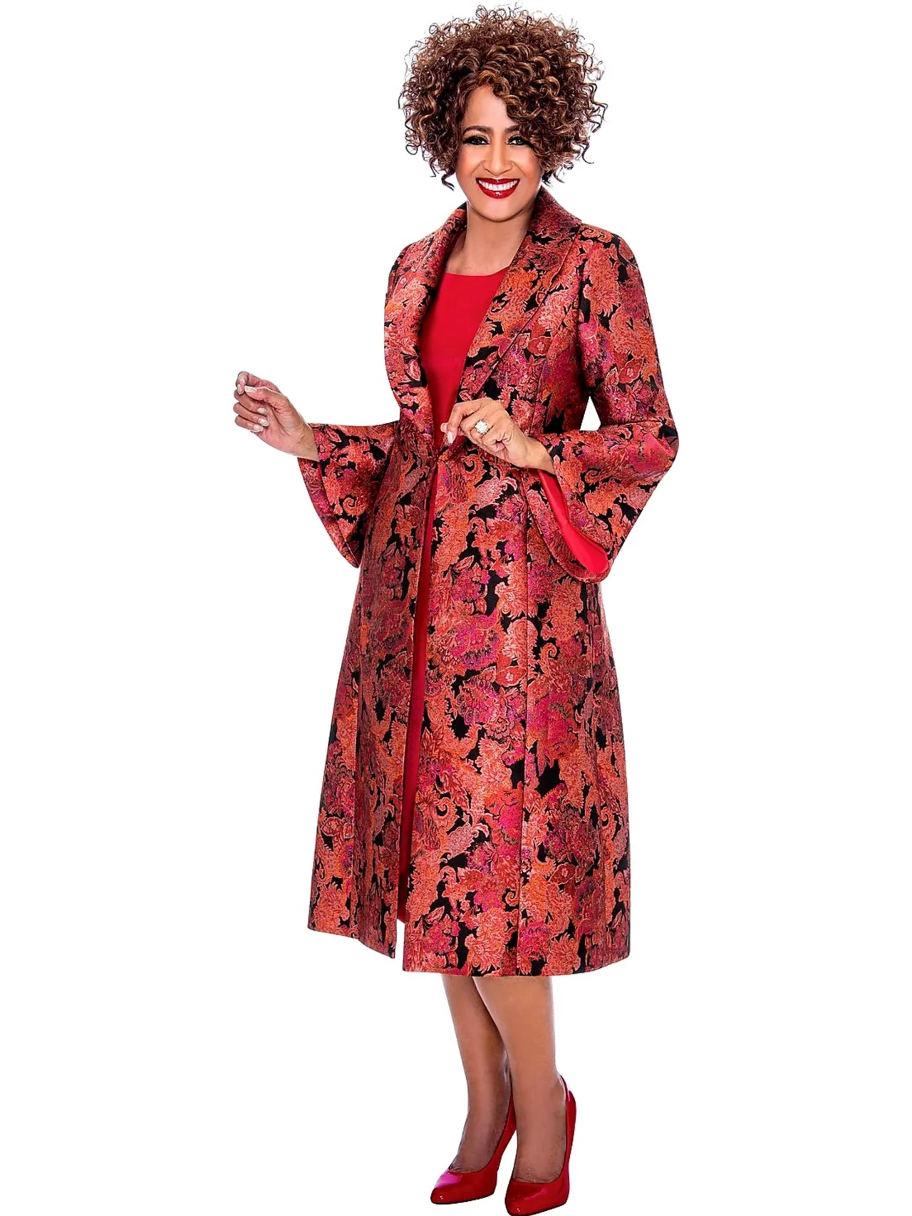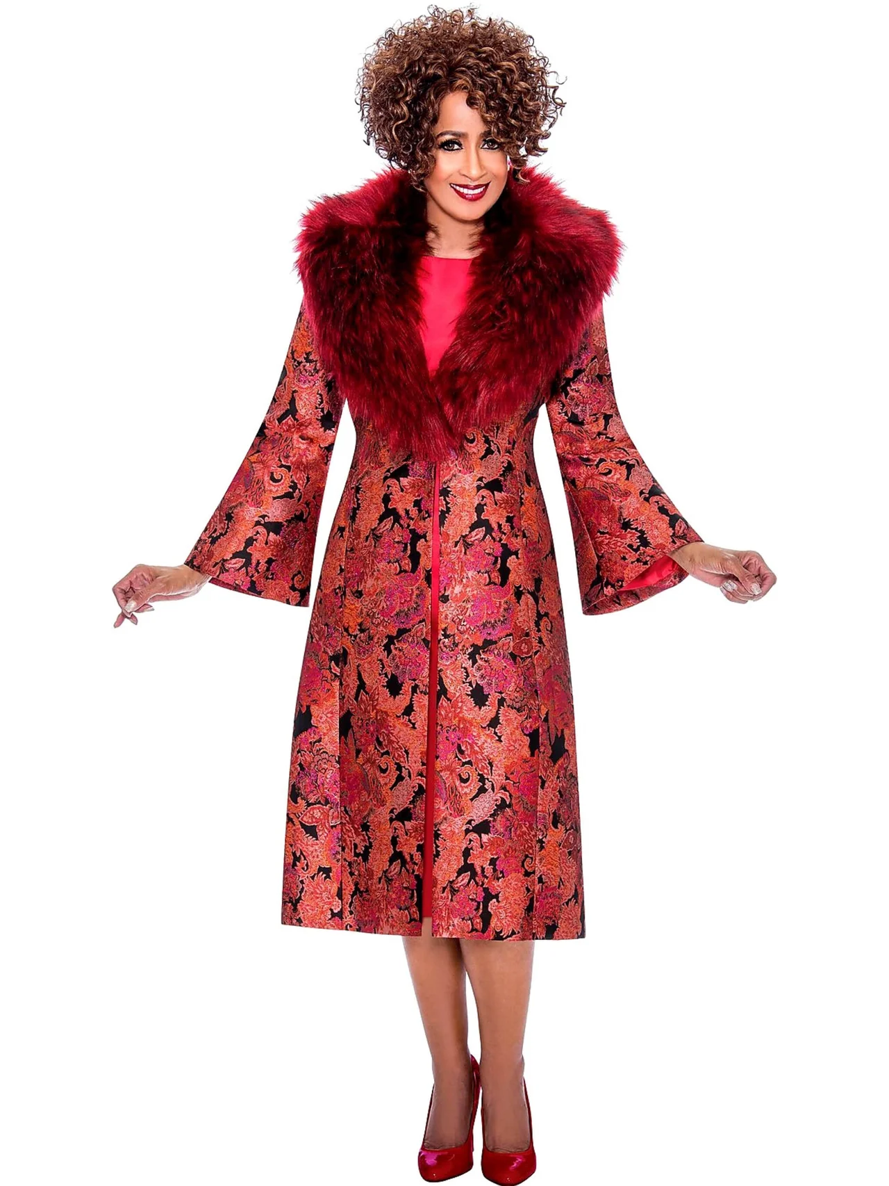 DORINDA CLARK STYLE DCC2232 A short sleeve midi dress that has a matching print duster jacket with long bell sleeves and a removable fluffy collar.